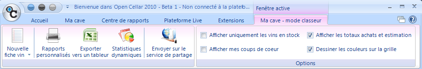 Reprenant les guidelines d'Office, chaque fenêtre disposera de sa propre barre de commandes, le principal avantage est d'exposer uniquement les fonctions nécessaires, et, en rapport avec l'action en cours. Ci dessous une partie des commandes de la fenêtre Ma cave - mode classeur.